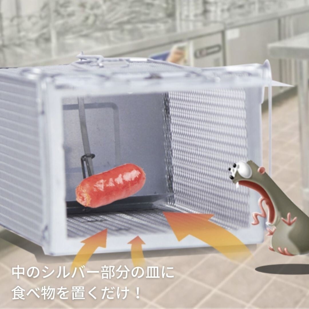 ネズミや鳥の通り道に仕掛けるだけで、捕獲できます。中にエサを置いておくとさらに効果的です