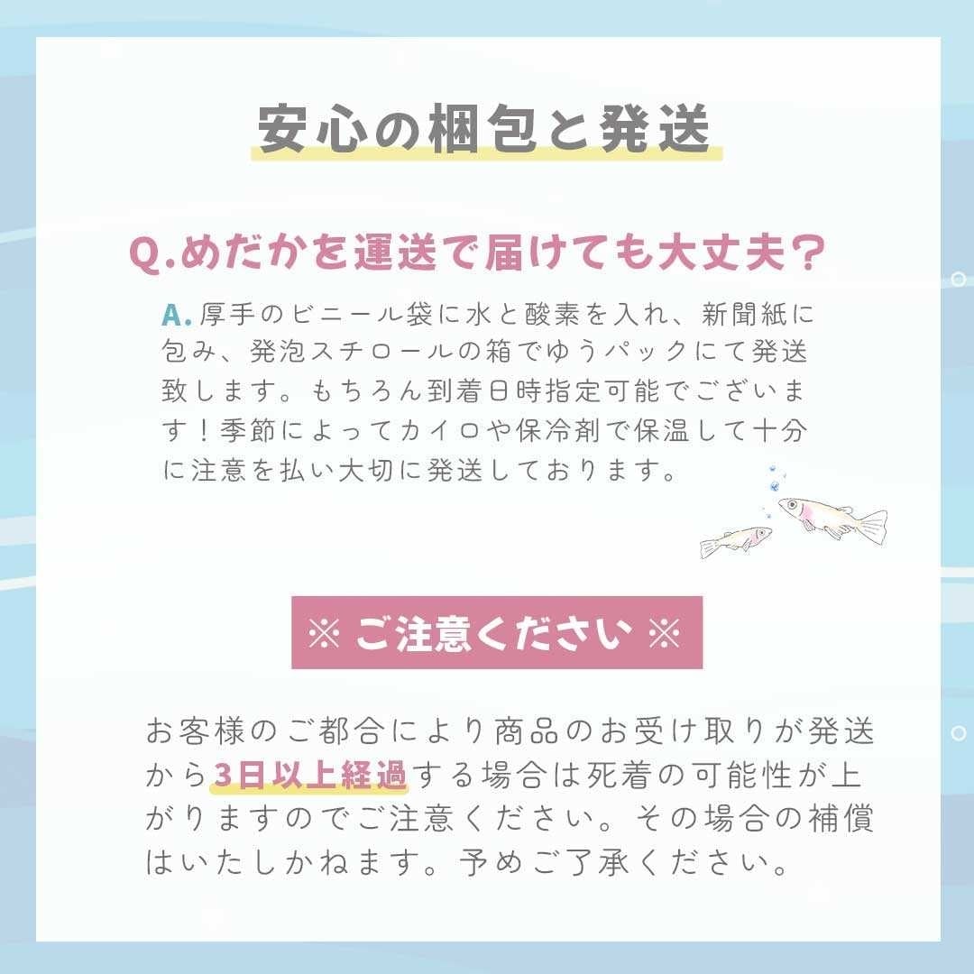 *お客様のご都合により商品のお受け取りが発送から3日以上経過する場合は死着の可能性が上がりますのでご注意ください。その場合の補償は致しかねます
