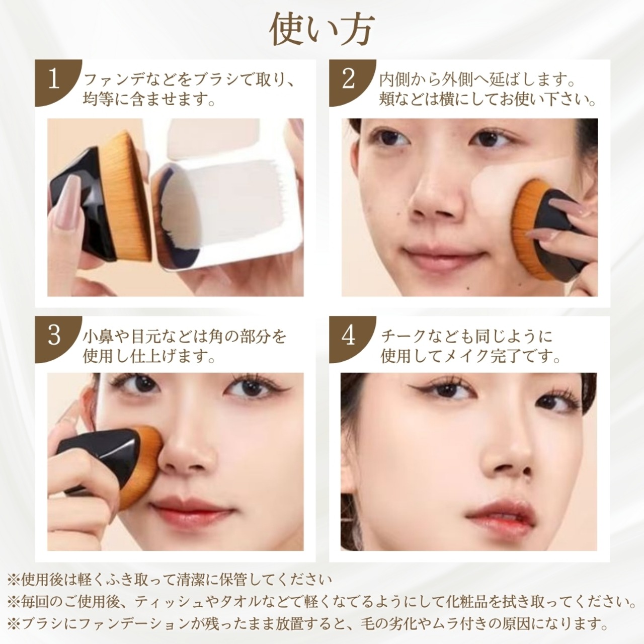 持ち手は滑りにくくグリップ力のあるデザインになっておりメイクを楽しめます、大きめなブラシ面により、ムラや厚塗り感のないナチュラルなメイクに仕上げることができます