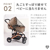 アーチ形のネットでフロント部分だけでなくベビーカーごとすっぽりとカバー。赤ちゃんがベビーカー内部で動いても手をぶつける心配のない広々スペースを確保