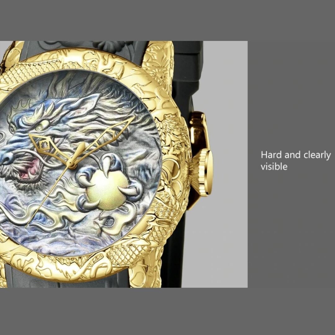 龍の刻印の入った文字盤が非常にインパクト大です。ずっしり重厚感のある作りで、実際重いです。ビッグフェイスの龍デザインでリューズも大きく、存在感抜群の腕時計となっております。3D浮き彫り加工で立体感のある龍デザインとなっております。水に強いラバーベルトには和柄の模様とこちらにも龍が刻まれております