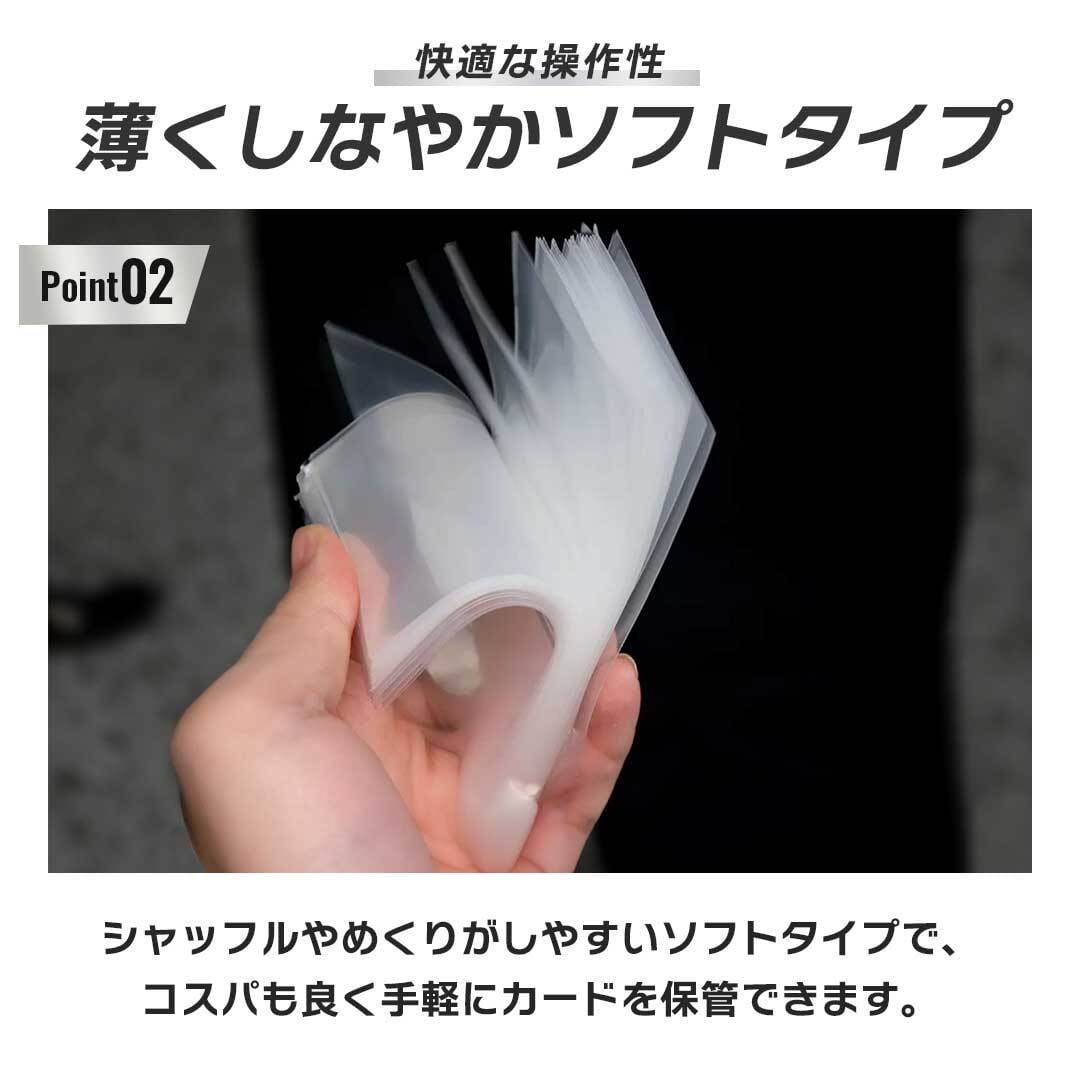 薄口でしなやかに作られている「ソフトタイプ」は、シャッフルがしやすくカードをめくりやすいため、操作性を重視したい方におすすめです。カードバトルをする方にとって操作性は重要なポイントとなるため、ゲームプレーヤーに人気のタイプとなっています。また、コスパもいいため手軽にカードを保管できるのも嬉しいポイントです