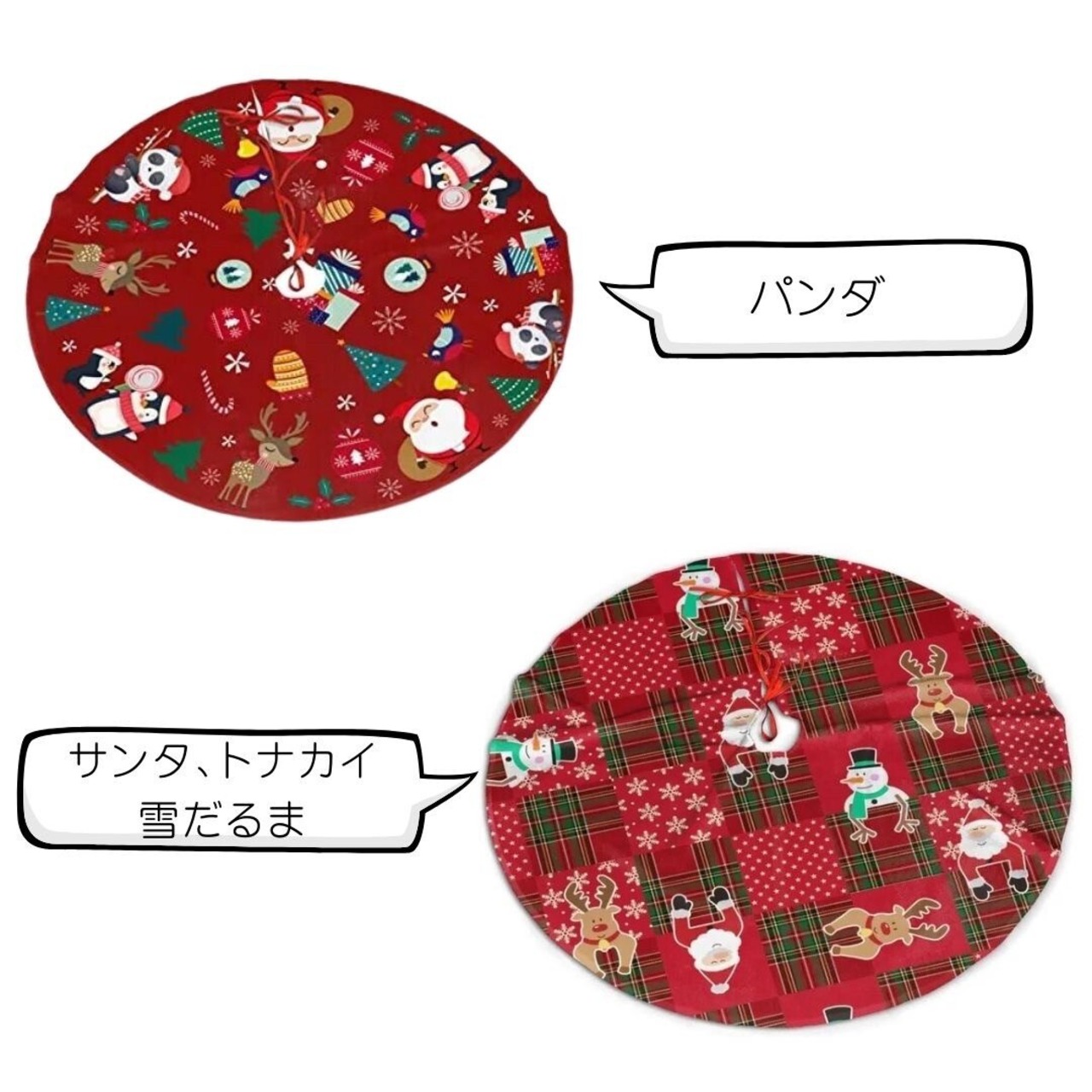 サンタさんやトナカイ、雪だるま、恐竜、パンダなどクリスマスツリーの足元をほっこりカバーするかわいいデザインはとても人気です