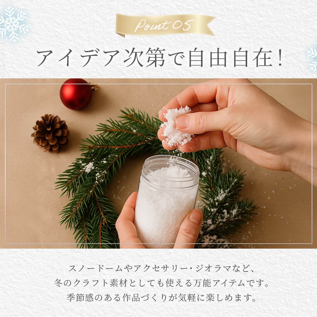 人工雪は本物の雪と同じような感触と見た目で、溶けない雪で暖かい室内でも雪を感じられる商品となっております。雪をリアルに再現できる素材でクリスマスツリーや鉄道模型、ジオラマなどの雪景色を再現するのに適しています。