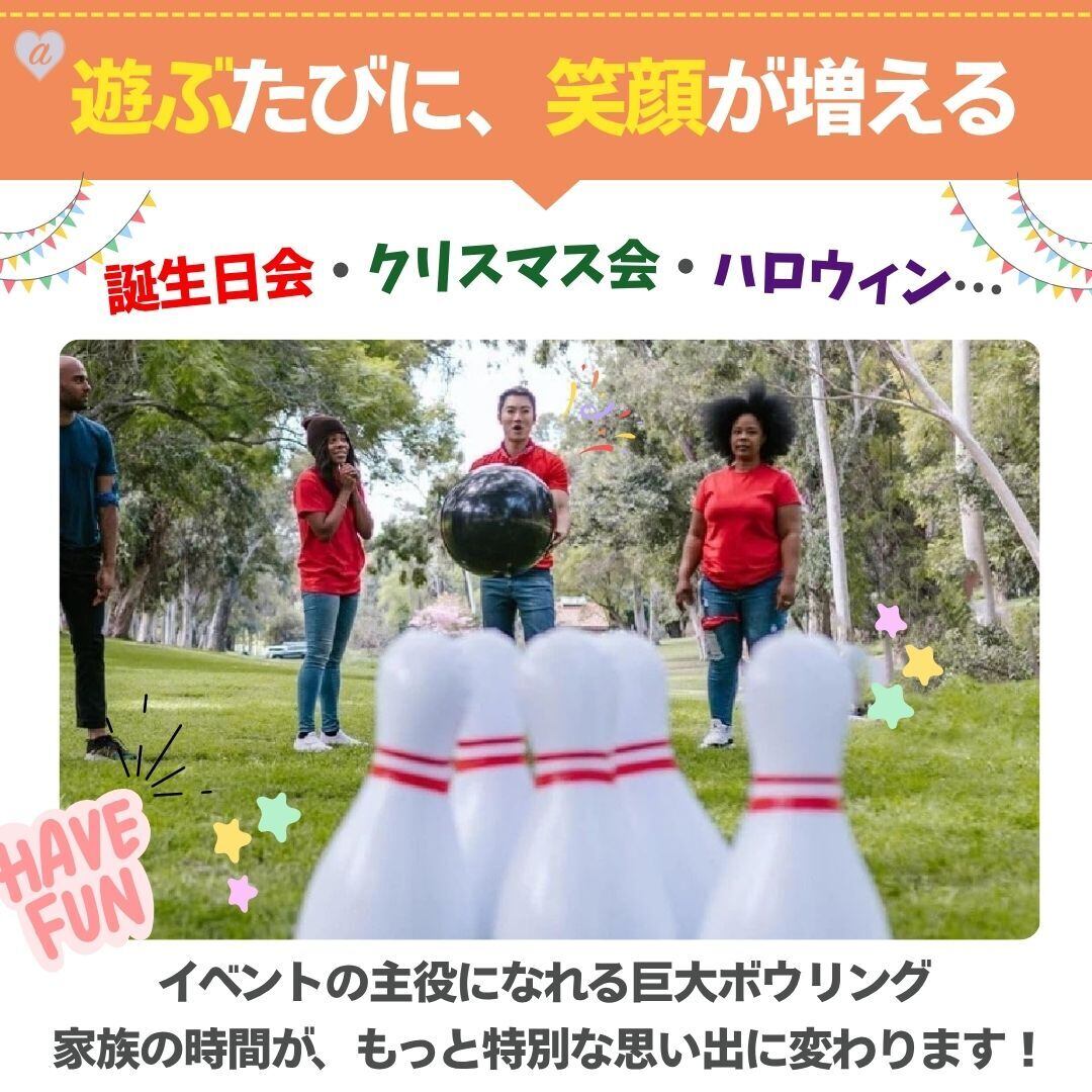 軽いPVC素材のバルーンだから、室内でも屋外でも安心して楽しめます。ボールを転がしてピンを倒す瞬間は、大盛り上がり間違いなし!