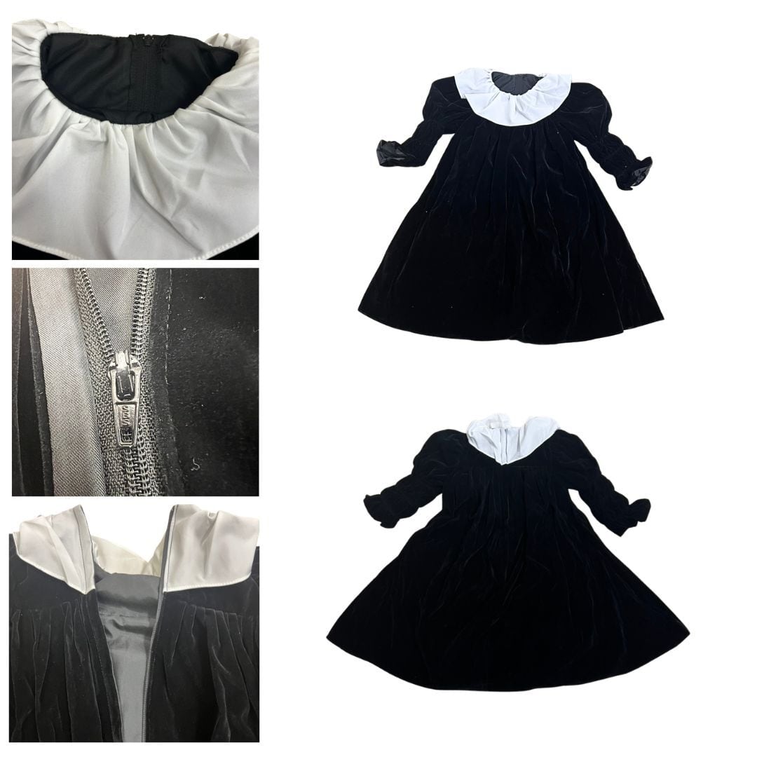 襟には白のピエロカラーが大きめになっていて、袖はふんわりの段々が可愛いマリースリーブです。シンプルで落ち着いたデザインですがとてもキュートな仕上がりになっております。後ろがファスナーになっているので着やすく脱ぎやすくなっています。