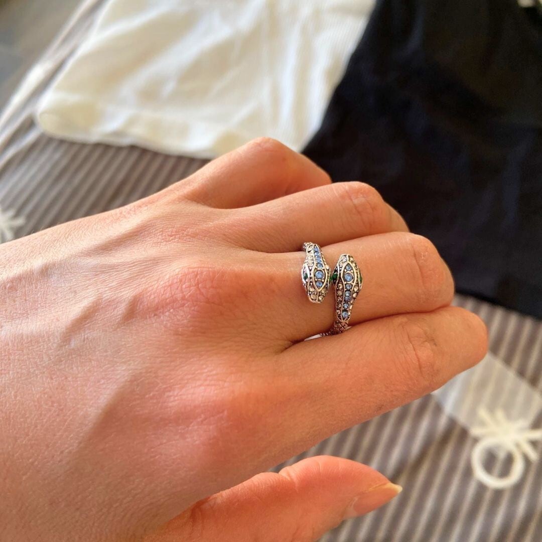 リング 二頭を持つヘビ ブルービーズ ガラスカット スネーク 蛇 snake 指輪 韓国ファッション シルバーカラー メンズ レディース リッチ 重量感 アクセサリー プレゼント ギフト クラブ CLUB ヒップホップ HIPHOP メタル ファッション