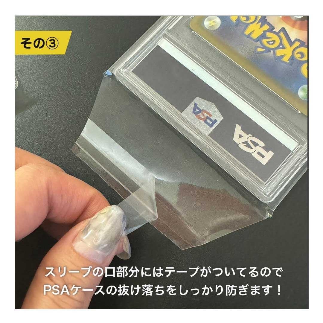 こちらはPSA鑑定ケース専用のスリーブとなっております。中身がPSA10でもケースが破損していたらそれだけで価値が下がってしまう場合があります。それを防ぐためのスリーブとなっており、鑑定済みのPSAをお持ちの方には必須の商品となっております