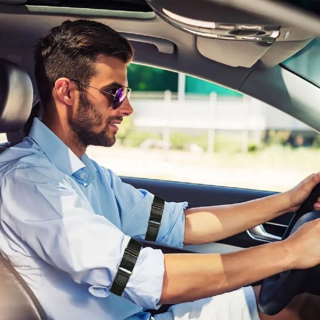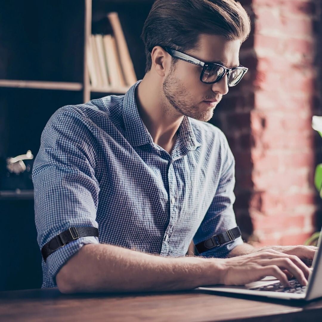 *男性は袖止めとして、カッターシャツの袖を上げ、アームバンドを装着すると自分のサイズに袖の長さを調節する事ができます。腕輪式で腕にハメるタイプは長さ調節できないタイプだと、締め付けで腕が痛くなりますが、こちらは長さ調節できますので自分の腕の太さに合わせることができます。またワイシャツを着た日、トレーナーを着た日では腕の太さが変わりますが、長さ調節できるので日々の服に合わせ調節して下さい