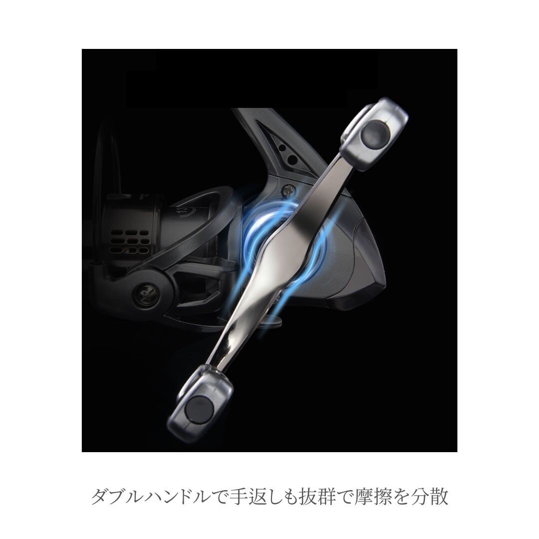 折りたたみ式ダブルハンドルは、耐腐食性に優れハンドルノブは滑りにくく軽量なプラスチック素材で、パワーファイトでも手が痛くならない作りになっています。ダブルハンドルは回転させるとハンドルの両側からの重量配分がリール全体に伝わるため、摩擦の分散に優れています。