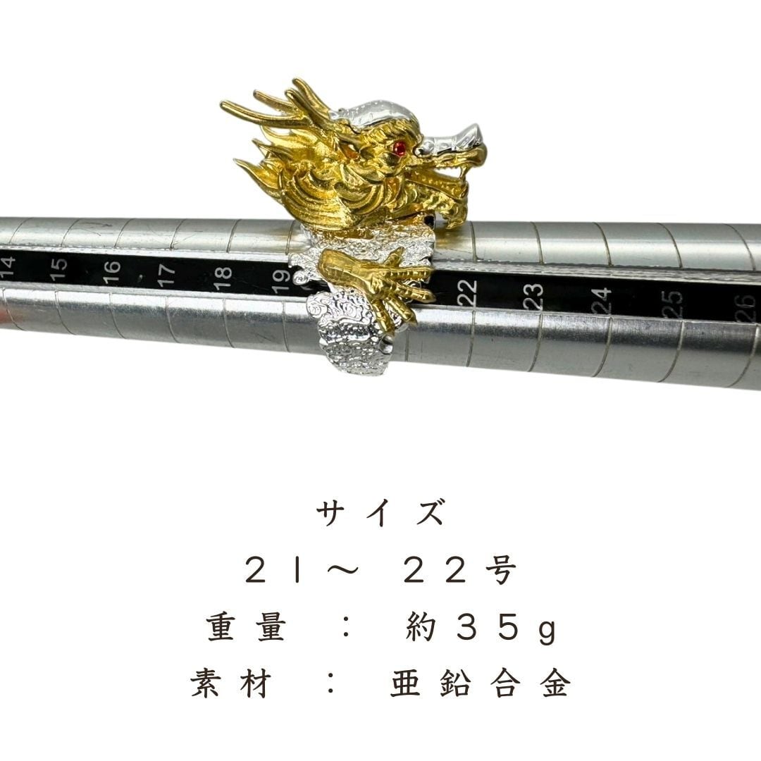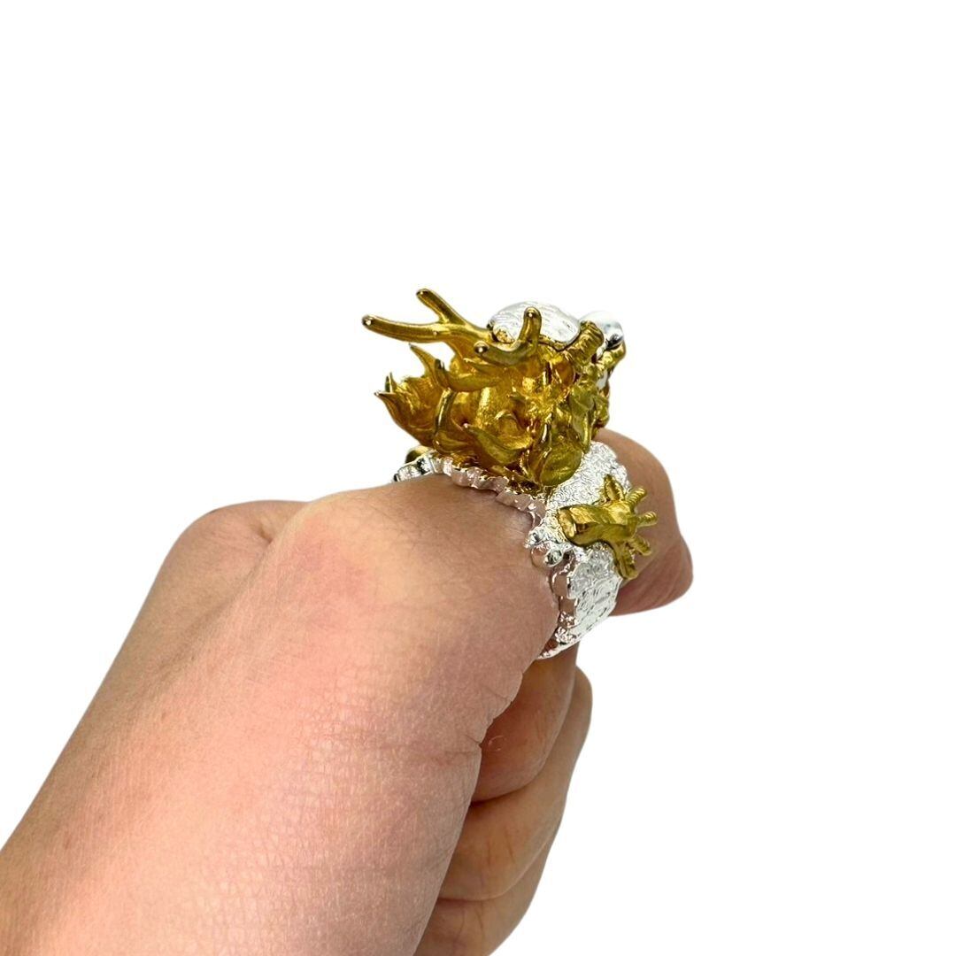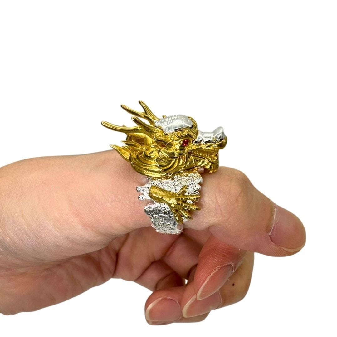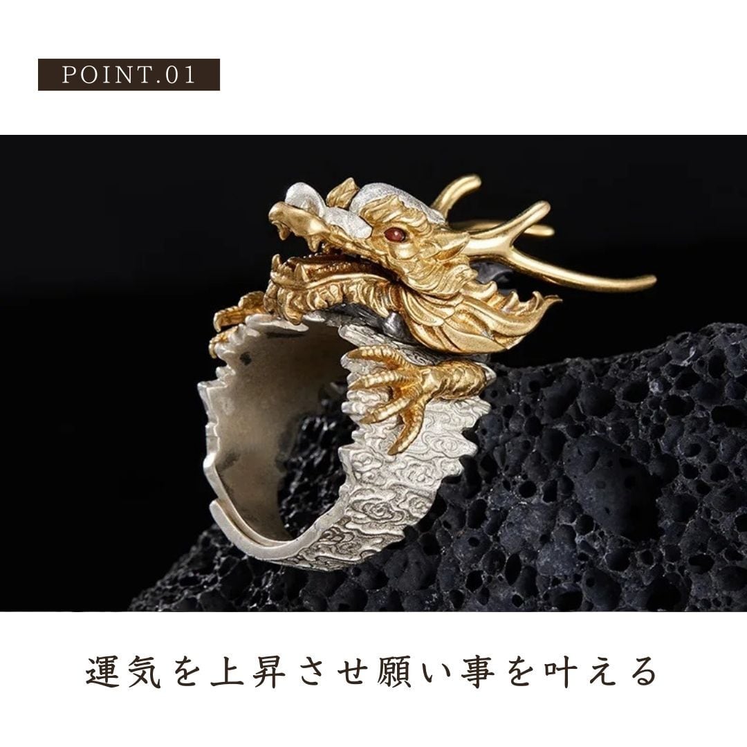 大迫力の金龍の頭部と白銀の台座のコントラストが美しいドラゴンモチーフデザインリング!