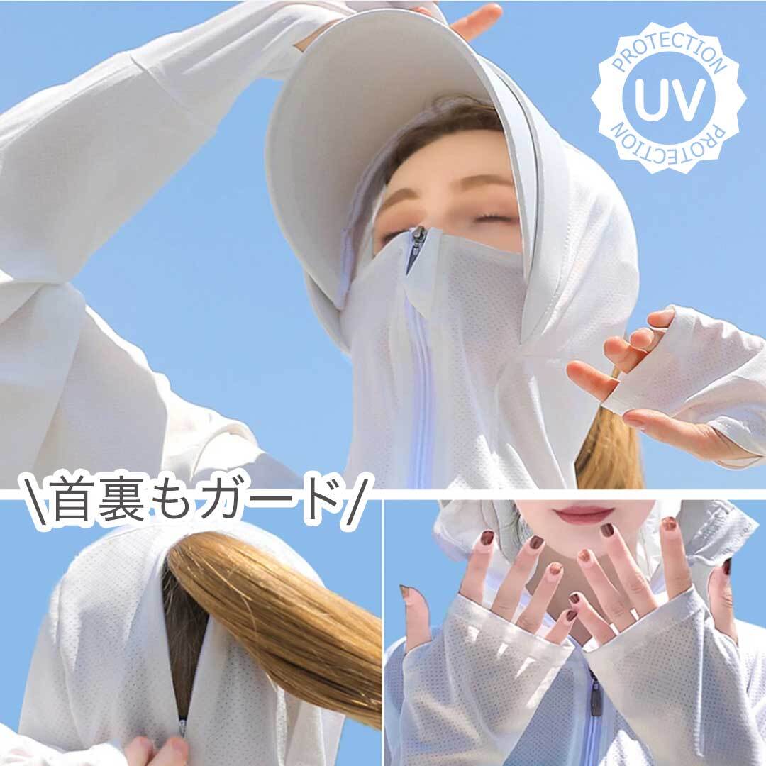 ファスナーを一番上まで上げれば目元を残し首元もお顔もすっぽりと包み込み、照り返しの紫外線からも守ってくれます