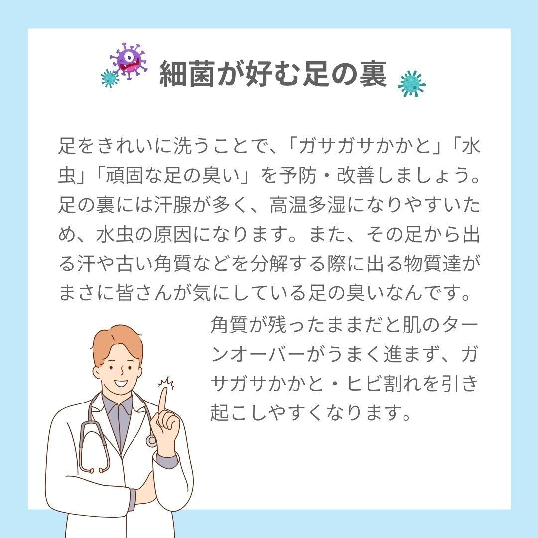 足の裏をしっかり洗うことで、角質除去、血行促進、足の臭い予防などを期待することができます。バスタイムのついでに使えば足をしっかり清潔に保ちスッキリ!足裏への刺激でリラックス効果も期待できます