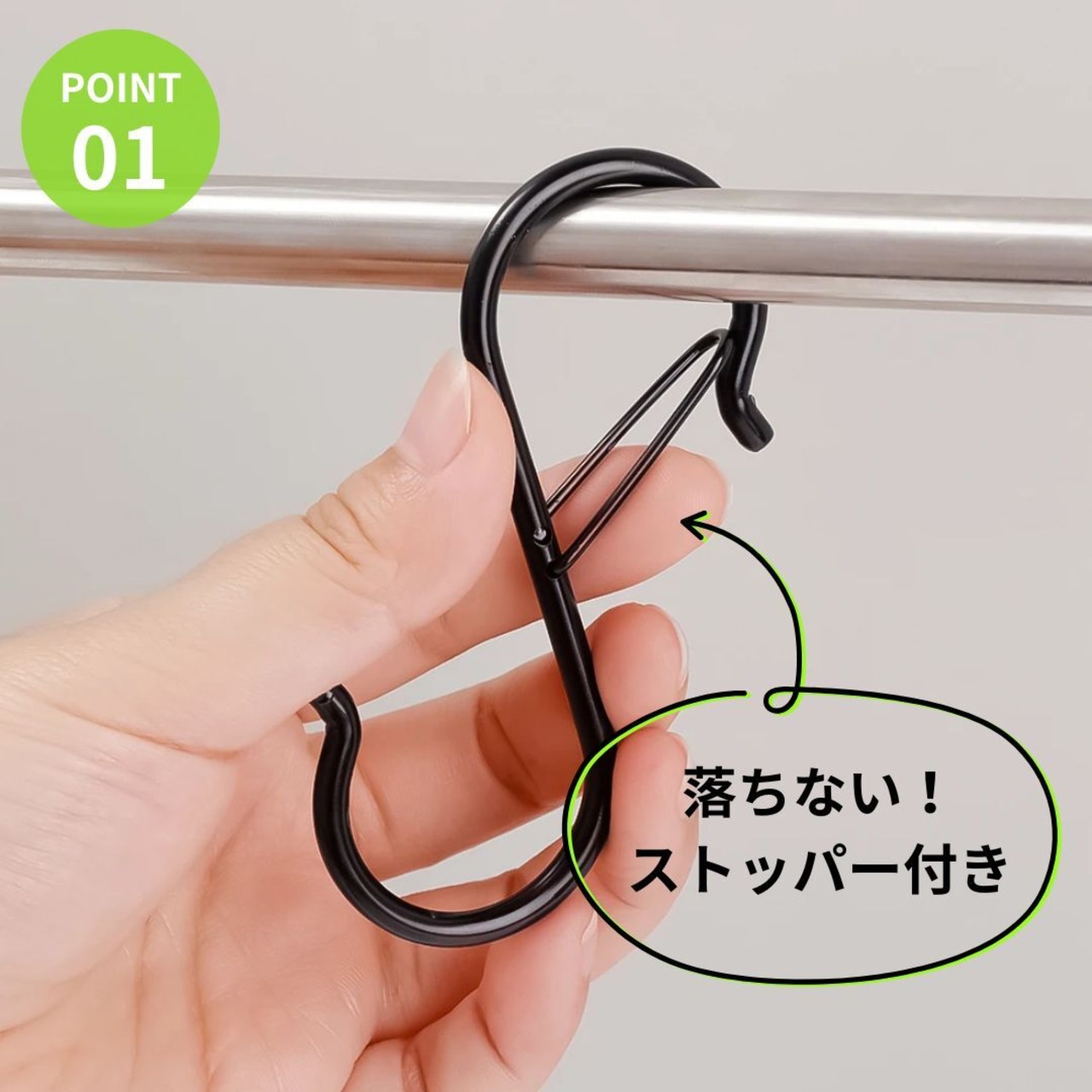 掛けたアイテムを取る度にフックも一緒に取れてしまう…そんなプチストレスを解決してくれる便利なアイテム、『カラビナ構造のS字フック』です